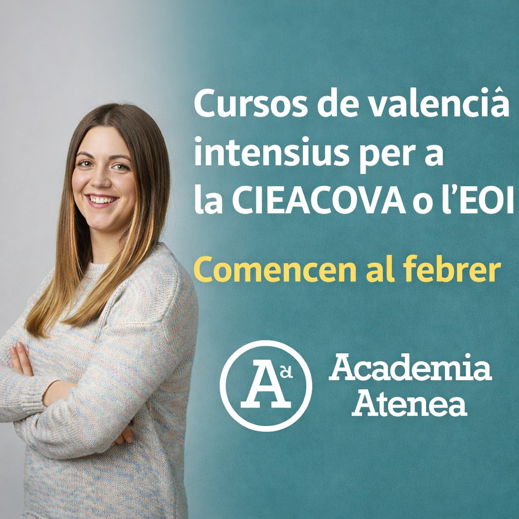 Marta Fernandez2024-10-14Trustindex verifica que la fuente original de la reseña sea Google. Cursos online en directo que se adaptan al horario del estudiante. Mi hija Eva ha aprobado a la primera un C1 con la ayuda de Miguel a quién quiero felicitar públicamente por su esfuerzo y dedicación. Gracias mil!! Catalin Marian2024-10-14Trustindex verifica que la fuente original de la reseña sea Google. He tenido una experiencia muy positiva, la academia es estupenda, tiene un profesorado excelente y una gran variedad de horarios. gisela giner rommel2024-10-03Trustindex verifica que la fuente original de la reseña sea Google. Estoy contentísima de haber elegido esta academia para preparar el nivel C1 de valenciano. Las clases súper buenas: didácticas y prácticas y con un montón de material e info para estudiar y practicar. Quiero dar las gracias a mi profesora Àngels por todo lo que me ha enseñado y en tan poco tiempo!!. También a Jordi, los dos son buenísimos y te ayudan un montón. J.C Soriano Gimenez2024-10-03Trustindex verifica que la fuente original de la reseña sea Google. He fet l'intensiu per al valencià de la JQCV nivell B1 i B2. La veritat és que els mitjans i els materials han sigut més que satisfactoris. Us recomane que és prepareu en aquesta acadèmia; els professors m'han resolt en amabilitat tots els dubtes que els he plantejat. Moltes gràcies a Juansar i a Fran. Raquel Martínez2024-09-19Trustindex verifica que la fuente original de la reseña sea Google. Equipo humano muy cercano y amable. Los profesores muy cualificados. Y ponen a tu disposición mucho material para que el estudio sea más fácil y comprensible! Ana Martinez2024-09-18Trustindex verifica que la fuente original de la reseña sea Google. Recomiendo prepararse en Atenea. Mi profesora ha sido Andrea y es genial, emplea una metodología muy dinámica y práctica, en clase nos enseña teoría, se realizan ejercicios, se practica mucho el oral, etc. El material está muy bien elaborado. Responde a los emails que necesitas y te corrigen las redacciones a nivel individual. Claudia Jimenez2024-09-11Trustindex verifica que la fuente original de la reseña sea Google. Sois increíbles, he tenido dos profesoras en esta academia buenísimas. Me saqué el C1 y C2 de valenciano con ellos hace un tiempo, y ahora el B2 de inglés. Recomiendo muchísimo a cualquier persona que esté dispuesta a sacarse un título que cuente con vosotros. Gracias a Raquel por haber sido la mejor profe de inglés! Ximo Romero2024-09-10Trustindex verifica que la fuente original de la reseña sea Google. Me apunté al B2 de inglés y pude empezar las clases el mismo día de apuntarme. Tanto la academia como mi profesor Miguel Saporta muy atentos y ayudando con cualquier duda o problema. Belén Taberner2024-09-06Trustindex verifica que la fuente original de la reseña sea Google. Me apunté a un curso de C1 de valenciano, online. Muy buen profesorado, las clases amenas y prácticas, bien preparadas. Finalmente hice el examen del C1 y C2 y los aprobé ambos. Muy contenta con la preparación! La evaluación general en Google es 4.8 de 5,